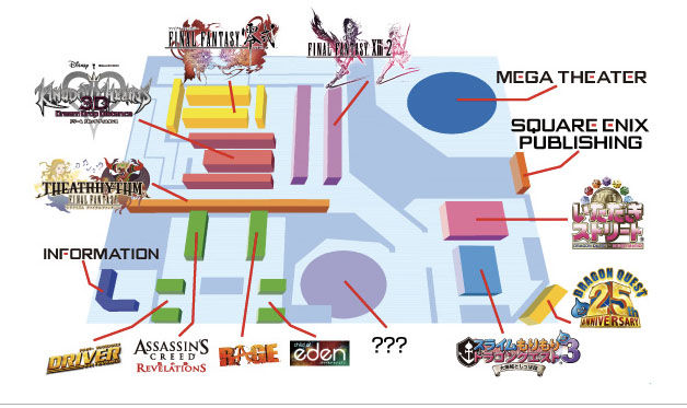 Square Enix has shared a map of their booth for the Tokyo Game Show next week. For the most part, there aren’t any surprises. The map is filled with titles that the company has previously announced, including Kingdom Hearts: Dream Drop Distance. Partner games are featured on the map as well.