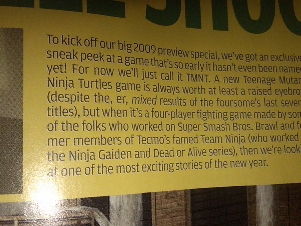“To kick off our big 2009 preview special, we’ve got an exclusive sneak peak at a game that’s so early it hasn’t even been named yet! For now we’ll just call if TMNT. A new Teenage Mutant Ninja Turtles game is always worth at least a raised eyebrow (despite the, er, mixed results of the foursome’s last several titles), but when it’s a four-player fighting game made by some of the folks who worked on Super Smash Bros. Brawl and former members of Tecmo’s famed Team Ninja (who worked on the Ninja Gaiden and Dead of Alive series), then we’re looking at one of the most exciting stories of the new year.”