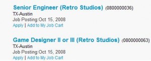 It’s been more than a year since Metroid Prime 3: Corruption, Retro Studios’ latest Wii project, was released. People have been wondering what Retro has been up to – In fact, the question has been whether the company has been up to anything at all. Good news: It’s more than possible that Retro Studios is actively engaged in some sort of development, and if not, the company probably will be doing so soon. Two job postings have been placed online, as Retro Studios is looking to hire a Senior Engineer and Game Designer II/III. The Senior Engineer job description duties include the obligation to “develop systems and content for Nintendo titles” and being “responsible for the development and integration of game systems and tools.” This information does not necessarily indicate that Retro has a new game in development, but the job description for the Senior Engineer is an encouraging sign for the future. It is clear now that the company isn’t just sitting around and taking time off – Retro definitely has something cooking in the kitchen.