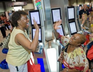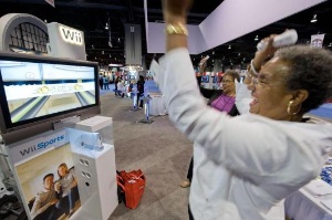 Brenda Stells of Berwyn, PA, watches as her friend Kathleen Marshall of Wyndmoor, PA, bowls a strike at Wii Sports: bowling at AARP’s annual Life@50+ Expo event at Washington, D.C.’s Walter E. Washington Convention Center. Nintendo’s interactive booth attracted crowds with live demonstrations of senior- and baby boomer-friendly video games for its Wii and Nintendo DS systems.