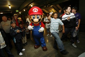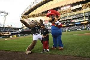Nintendo’s Mario celebrates the launch of Mario Super Sluggers with Jetrin Wichienwidhtaya, of Seattle, by participating in the pre-game ceremony at the Seattle Mariners game at Safeco Field in Seattle on Sept. 5, 2008. Mario Super Sluggers is the first Mario baseball title for Wii and launched on Aug. 25, 2008. (Courtesy of Nintendo)