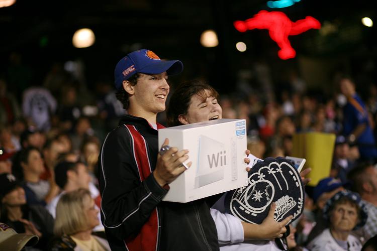 Derek Freeman, of Falkland, British Columbia, reacts after winning a Wii and copy of Mario Super Sluggers at the Seattle Mariners game at Safeco Field in Seattle on Sept. 5, 2008. Mario Super Sluggers is the first Mario baseball title for Wii and launched on Aug. 25, 2008. (Courtesy of Nintendo)