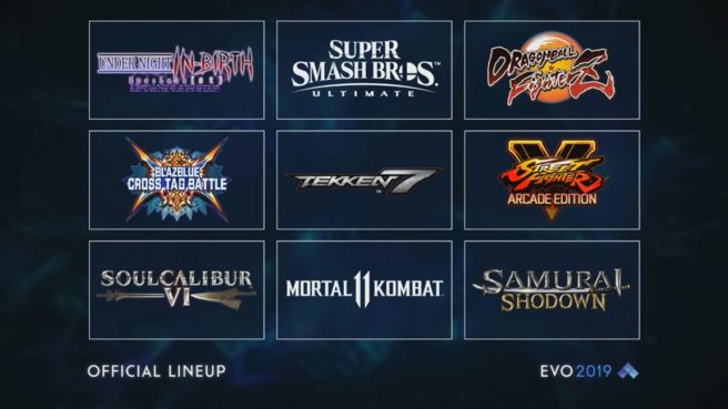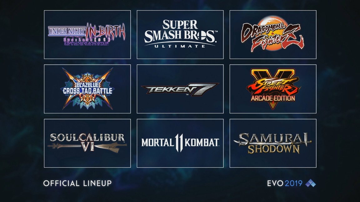 During a live stream event today, the full lineup for Evo 2019 was unveiled. The fighting tournament will feature a total of nine games. Super Smash Bros. Ultimate, Mortal Kombat 11, Dragon Ball FighterZ, BlazBlue: Cross Tag Battle, Samurai Shodown, Under Night In-Birth Exe:Late[st], Tekken 7, Soulcalibur VI, and Street Fighter V: Arcade Edition comprise the lineup.