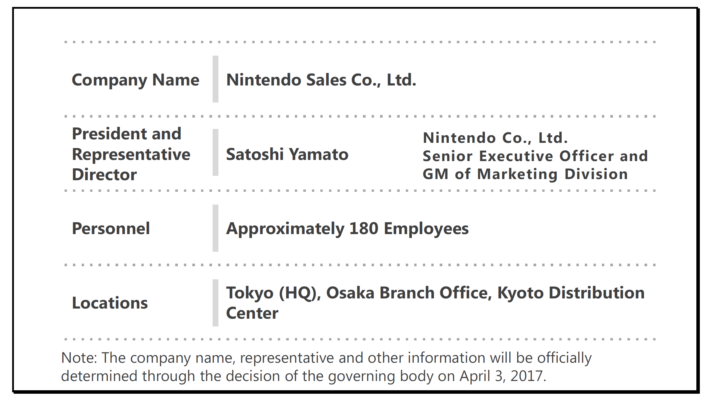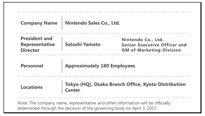 Finally, I would like to cover our sales company that is planned to start operations in Japan on April 3. In August 2016, we announced that we would acquire one of the largest distributors in Japan handling Nintendo products, JESNET Co. Ltd., as a subsidiary, and that we would accept an assignment of business from AJIOKA Co., Ltd. The purpose of the newly-established company is to provide an integrated system from the development through supply of our products, allowing for rapid decision making and an improvement in sales service. It will operate under the name Nintendo Sale Co., Ltd. The company overview is presented here
