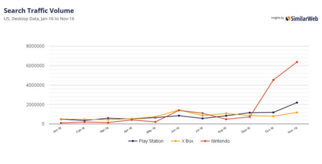 Data collected by internet-data firm SimilarWeb reveals that Nintendo-related terms grew to triple the size of PlayStation/Xbox-related searches. Pokemon GO helped contribute to the growth during the summer, but the biggest spike resulted from Switch’s announcement in October. The NES Classic Edition and Super Mario Run then added further to Nintendo’s buzz.