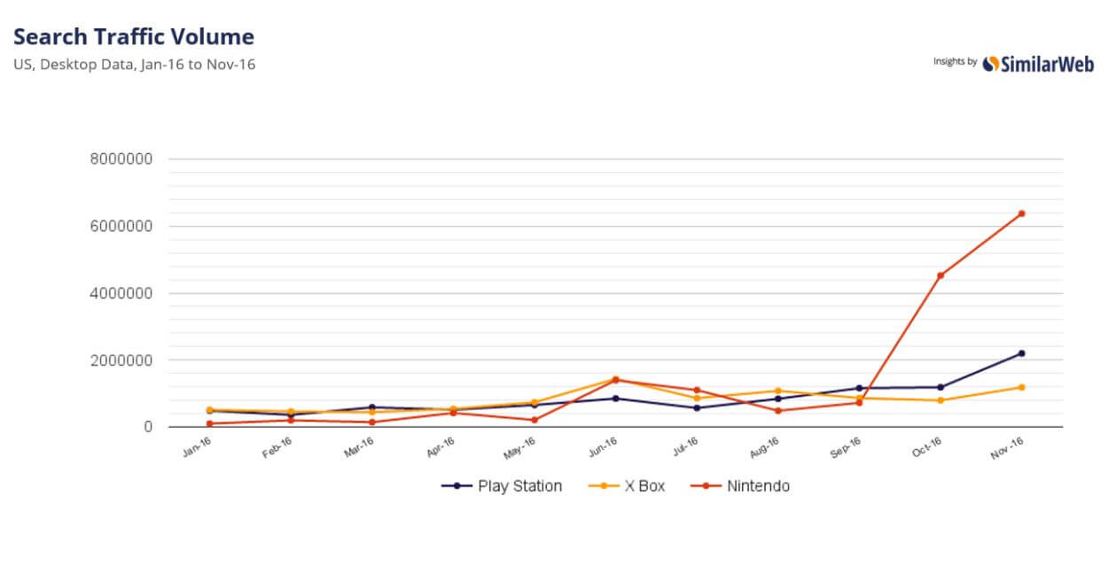 “The growth in Nintendo’s search traffic over 2016 is so big that when comparing its search traffic in November 2016 to January 2016, it multiplied its search traffic by [a factor of] 60.”