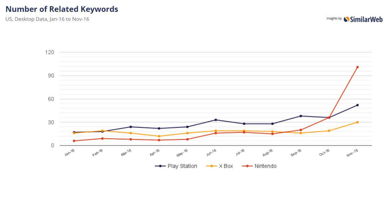 “In January 2016, we were able to identify a total of 39 keywords generating traffic for these brands. Nintendo had 6, Xbox had 16, and PlayStation had 17. While in November 2016, we were able to identify 183 of such keywords. [And now], Nintendo had 101, Xbox had 30, and PlayStation had 52.”