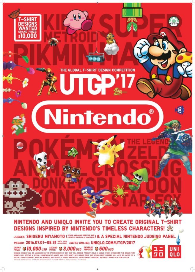 UNIQLO UT Grand Prix winners will be notified in Spring 2017. They’ll receive up to $10,000 in prize money, and an invitation to attend a special awards ceremony in Japan. Shigeru Miyamoto will be one of the competition’s judges and will also be present at the awards ceremony. Major prize winners will also receive a NX signed by Miyamoto.