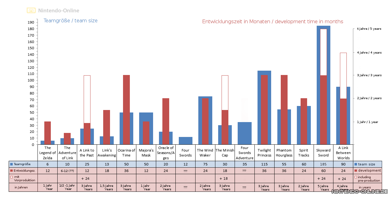 German website Nintendo-Online.de has published an article analyzing the development teams of the Zelda series over the past 28 years. In conjunction with the article, the site created a chart showing sizes of the different teams are as well as how long development lasted. While they’re mostly approximate numbers, the chart gives a good look at the development of the Zelda games.