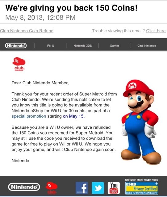 Those who ordered Super Metroid from Club Nintendo and are now receiving a full refund – yes, the complete 150 coins. You should be getting the full amount back as long as you’re a Wii U owner. Amazingly, these Club Nintendo users can still keep the download code for use on the Wii U or Wii.