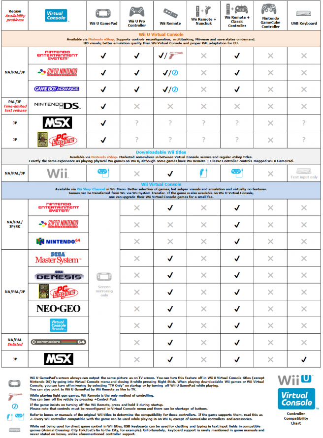 NeoGAF’s “DownGrader” has put together a handy Wii U Virtual Console controller compatibility chart. Check it out above.