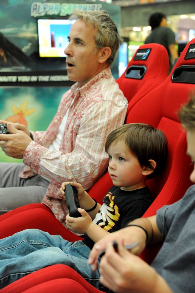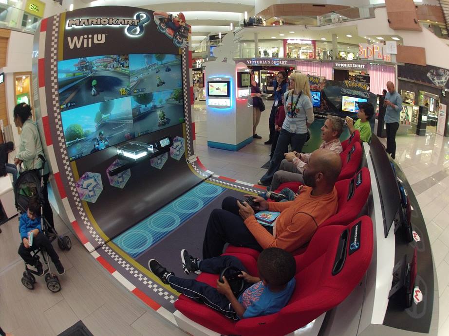 In this photo provided by Nintendo of America, fathers and sons race against each other in Mario Kart 8 on a giant HD TV screen at the Westfield Culver City mall in Los Angeles on Nov. 24, 2014. Throughout the Holiday season until Dec. 21, 2014, Nintendo is visiting 16 malls across the country to offer consumers a break from holiday shopping to play the season’s must-have games for Wii U and Nintendo 3DS/2DS, including amiibo, Nintendo’s new toys-to-life figures based on favorite video game characters including Mario, Donkey Kong and Pikachu. (Photo by Nintendo/Bob Riha, Jr.)