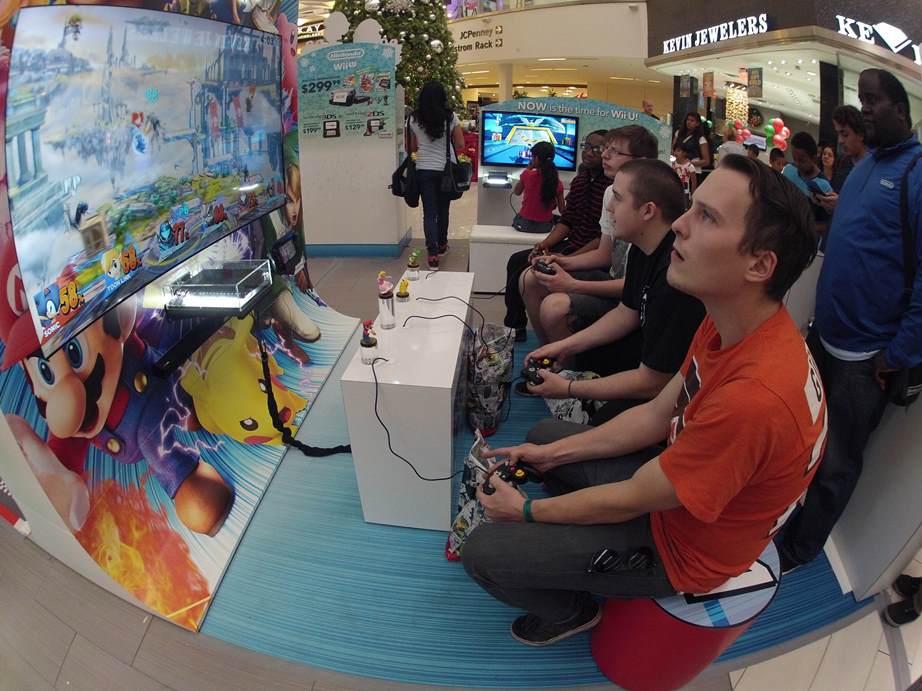 In this photo provided by Nintendo of America, Jacob O., 24, of Philadelphia (R), competes against other consumers playing Super Smash Bros. for Wii U at the Westfield Culver City mall in Los Angeles on Nov. 24, 2014. Until Dec. 21, 2014 in 16 malls nationwide, many of Nintendo’s games will be playable in fun, interactive spaces that kids ? and kids-at-heart ? will love, including large high-definition displays that will host a Mario Kart 8 and Super Smash Bros. for Wii U. Visitors can also check out the recently released Pokémon Omega Ruby and Pokémon Alpha Sapphire as well as amiibo, Nintendo’s new toys-to-life figures based on its favorite video game characters including Mario, Donkey Kong and Pikachu. (Photo by Nintendo/Bob Riha, Jr.)