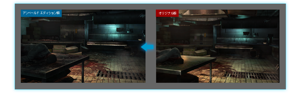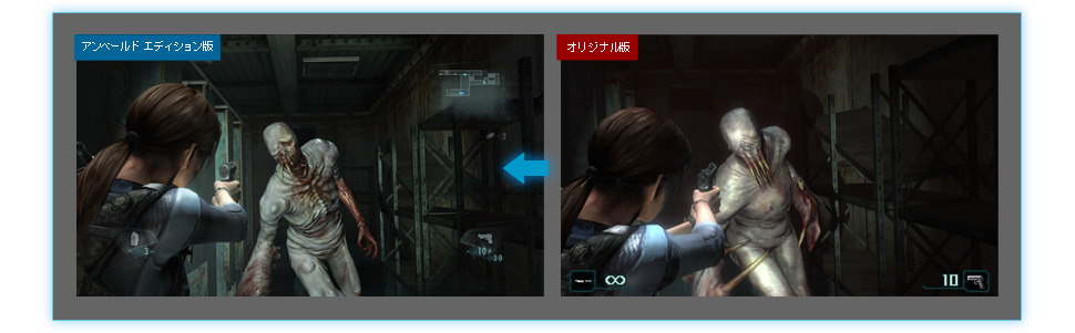 The official Japanese Resident Evil: Revelations HD website contains a few comparison images. Two of the shots compare the original 3DS game to the HD update while the other three show the differences between the Infernal and Casual/Normal mode.