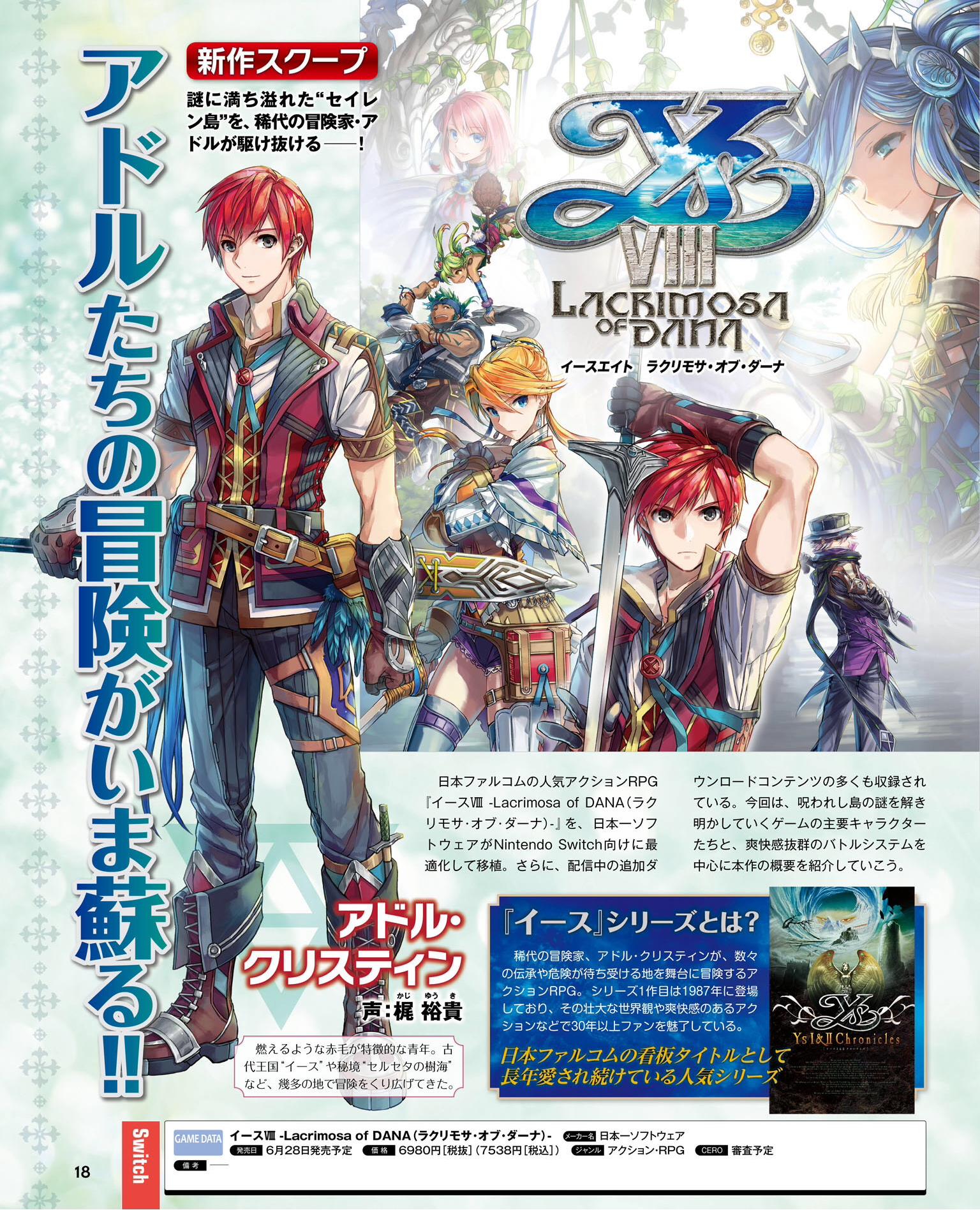 This week’s Famitsu scans are now available. Highlights include Ys VIII Switch, Lode Runner Legacy, Octopath Traveler, and Hyrule Warriors: Definitive Edition. Scans of all games are below.