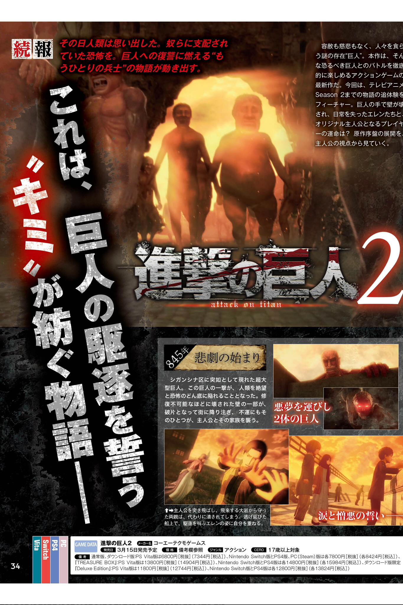 This week’s Famitsu scans are now available. Highlights include Kyogeki Quartet Fighters, BlazBlue: Cross Tag Battle, and Attack on Titan 2. Scans of all games are below.