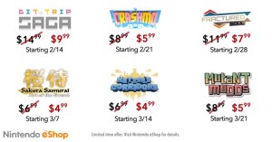Nintendo will be slashing the price of several titles on the 3DS eShop starting this week. Bit.Trip Saga has been discounted from $14.99 to $9.99. Other upcoming sales include Mutant Mudds, Crashmo, and Sakura Samurai. The full lineup with dates and prices can be found in the image above.