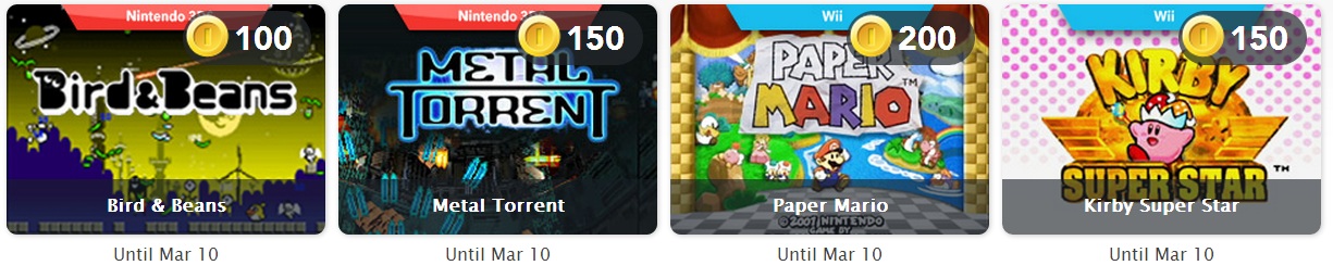 This month’s digital rewards on Club Nintendo have gone live. Members can choose from Bird & Beans (3DS, 100 coins), Metal Torrent (3DS, 150 coins), Paper Mario (Wii, 200 coins), and Kirby Super Star (Wii, 150 coins). These rewards will last until March 10.