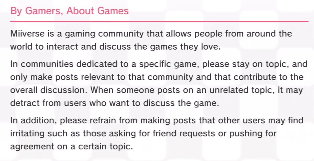 – Nintendo doesn’t want off-topic posts any longer, don’t condone openly asking for friend requests or pushing for agreement on a certain topic