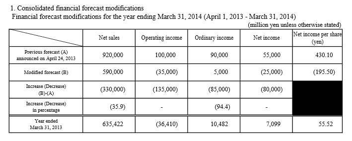 We revised our full-year consolidated financial forecasts for the fiscal year ending March 31, 2014 that we announced at the beginning of the fiscal year by estimating new net sales of 590 billion yen against the initially projected net sales of 920 billion yen, new operating loss of 35 billion yen against the initially projected operating profit of 100 billion yen, new ordinary income of five billion yen against the initially projected ordinary income of 90 billion yen, and new net loss of 25 billion yen against the initially projected net income of 55 billion yen. Foreign currency assumptions for the end of the fiscal year have been revised from 90 yen to 100 yen per U.S. dollar and from 120 yen to 140 yen per euro.