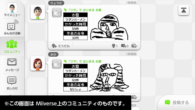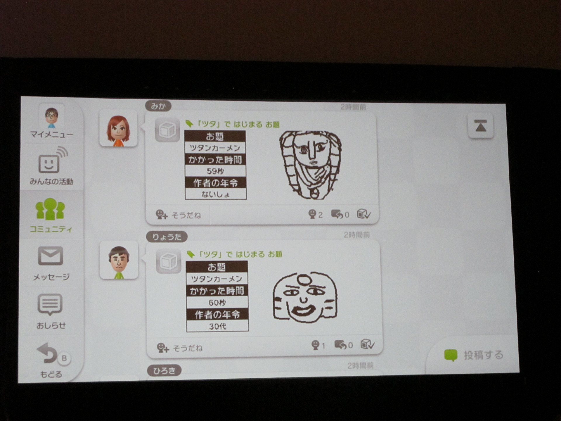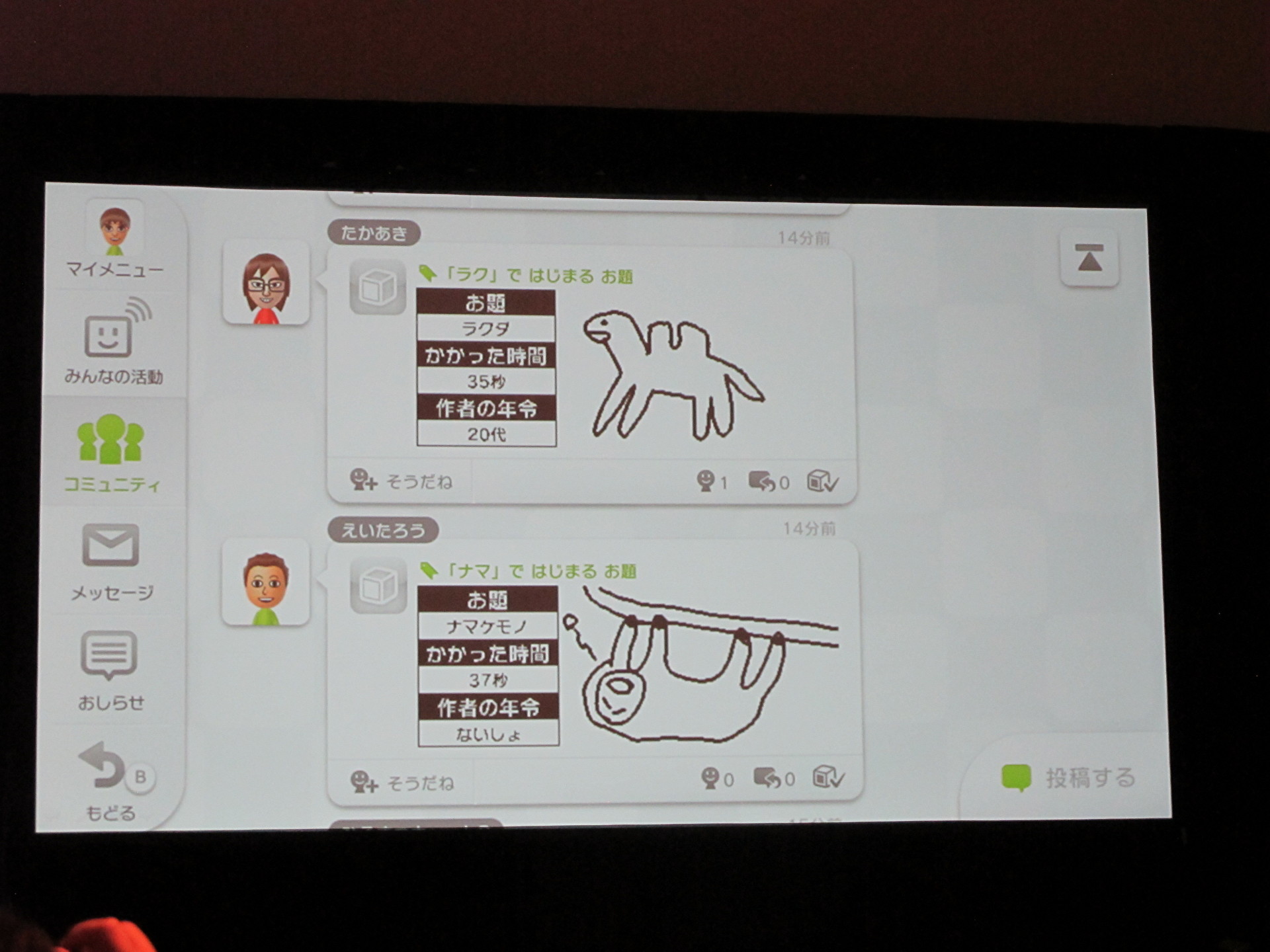 Yesterday, Kiyoshi Mizuki revealed an interesting Miivese feature during Nintendo’s Miiverse session at GDC 2013. The game will include the “Miiversketch” feature, a mode that requires players to quickly draw items on the GamePad from memory. Drawings will be added to a special Miiverse board once the designated time expires.