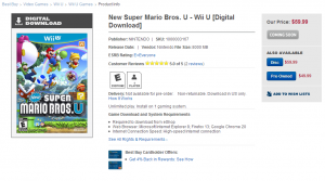 An alternative method may soon be available to consumers. Best Buy posted a product listing on its website for a digital download version of New Super Mario Bros. U. The listing may be a sign that retailers will soon begin selling downloadable versions of retail Wii U titles.