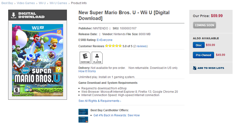 New Super Mario Bros. U digital download version listed on Best Buy website