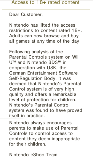 In the past, European Wii U and 3DS owners could only purchase mature titles at night. There had been issues relating to German law, making it impossible to download such content during the day time.