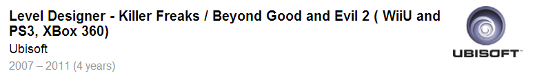 The listing is a bit nebulous as Audrain mentions Killer Freaks – ZombiU before it was ZombiU – and Beyond Good & Evil 2 in the same category. Apparently he contributed to Beyond Good & Evil 2 sometime between 2007 and 2011. The PlayStation 3, Xbox 360, and Wii U may have been intended platforms for development, but this point is also unclear due to the way Audrain lists both titles.