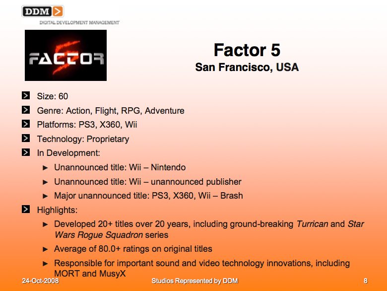 Factor 5 is said to have been working on two Wii projects most recently. And apparently, development on both games will be wrapped up by year’s end. Only one of the titles has a publisher right now, however.
