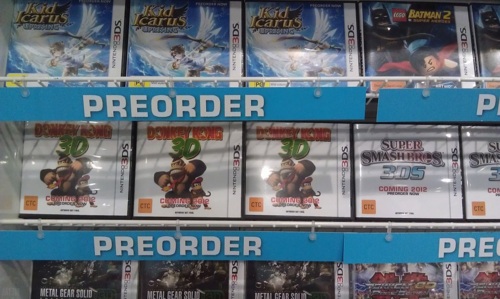 It seems that EB Games is taking pre-orders for “Donkey Kong 3D”. Mock boxes of the game are shown in the image above next to the likes of Kid Icarus: Uprising and Smash Bros. 3DS.