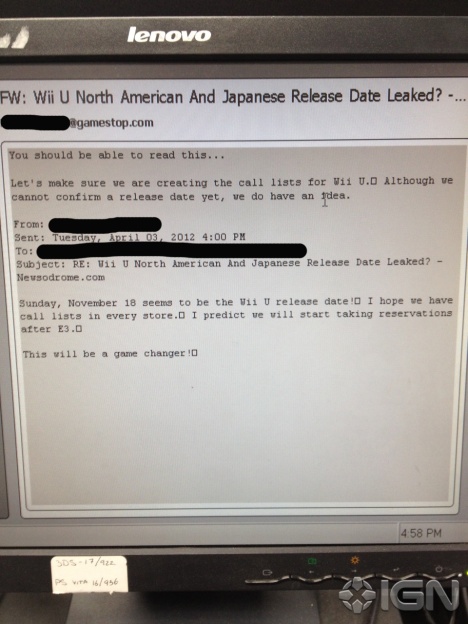 The photo above comes from an email sent by a GameStop Regional Manager. IGN says it “seems to support the notion that the Wii U very well might release on November 18 as speculated.”