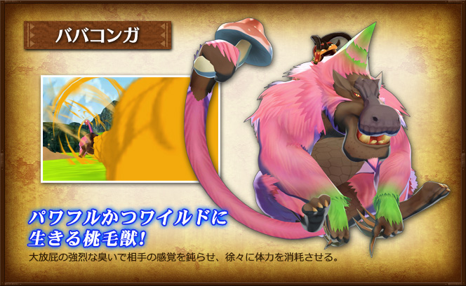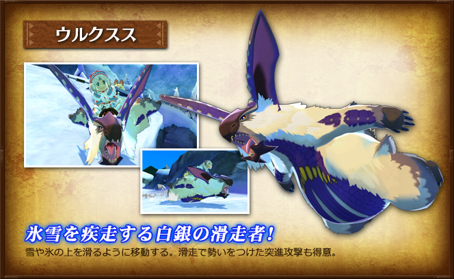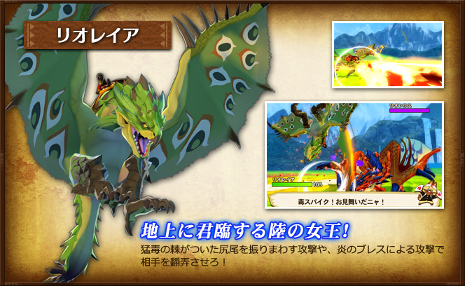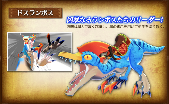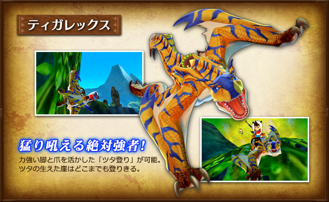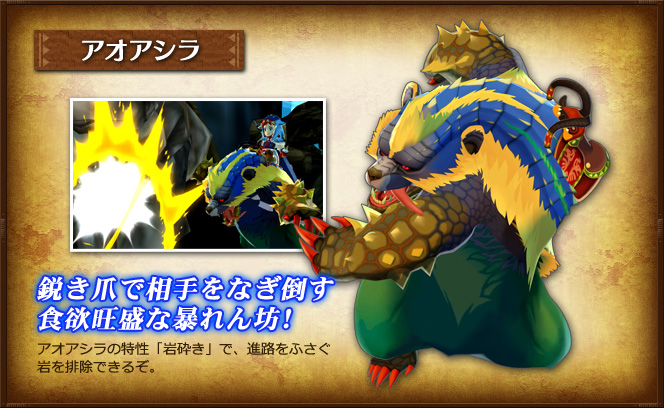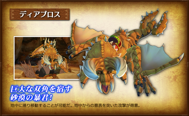 – Rathian, Tigrex, Lagombi, Diablos, Arzuros, Khezu appearing in the game