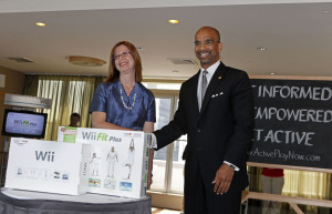 In this photo provided by the American Heart Association and Nintendo of America, Dr. Clyde Yancy, president of the American Heart Association, and Cammie Dunaway, Nintendo of America’s executive vice president of Sales & Marketing, unveil new boxes, featuring the American Heart Association brand, for Nintendo’s popular Wii Fit Plus software, Wii Sports Resort software and Wii console at an event in New York on May 17, 2010. The new boxes are part of a strategic relationship between the organizations that helps educate and empower people to lead healthy lifestyles through physically active play. (David Goldberg/AP Images for American Heart Association and Nintendo of America)