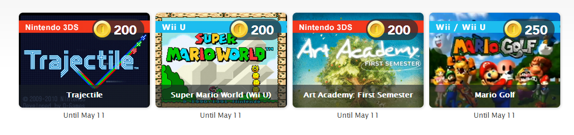 This month’s digital rewards on Club Nintendo have gone live. Members can choose from Trajectile (3DS, 200 coins), Super Mario World (Wii U, 200 coins), Art Academy: First Semester (3DS, 200 coins), and Mario Golf (Wii/Wii U, 250 coins). These items last through May 11.