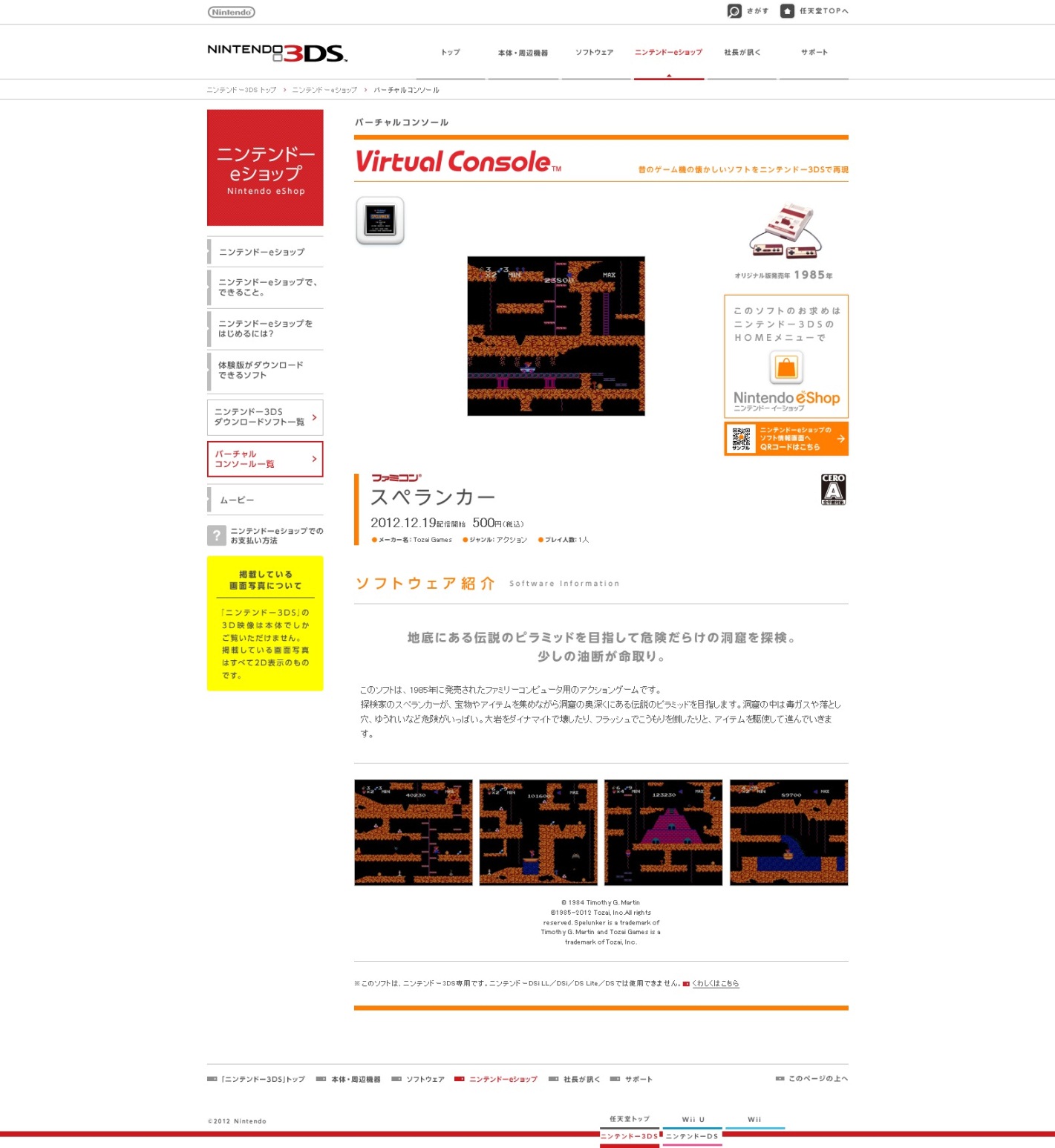 Spelunker will be hitting the Japanese eShop as a Famicom download on December 19 for 500 yen. Screenshots of the game can be found above.