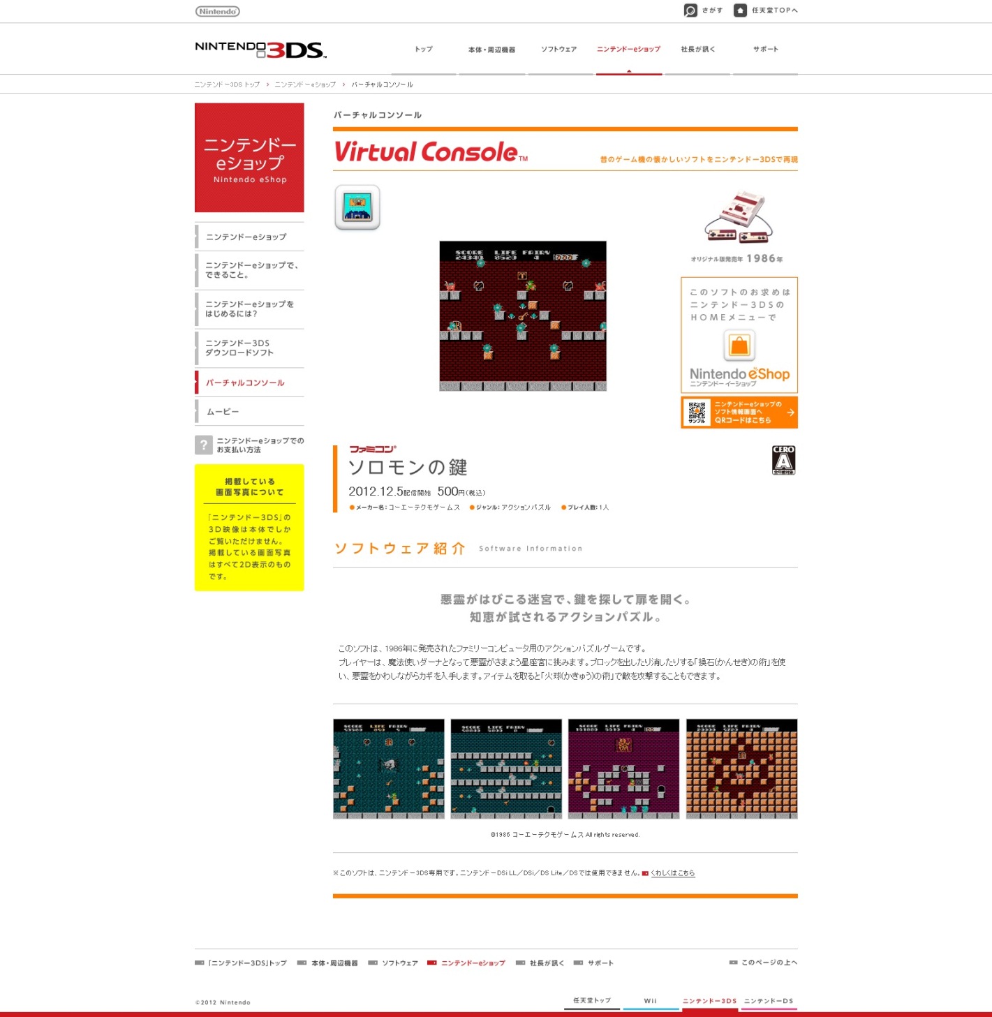 Solomon’s Key will be hitting the Japanese eShop as a Famicom download on December 5 for 500 yen. Screenshots of the game can be found above.