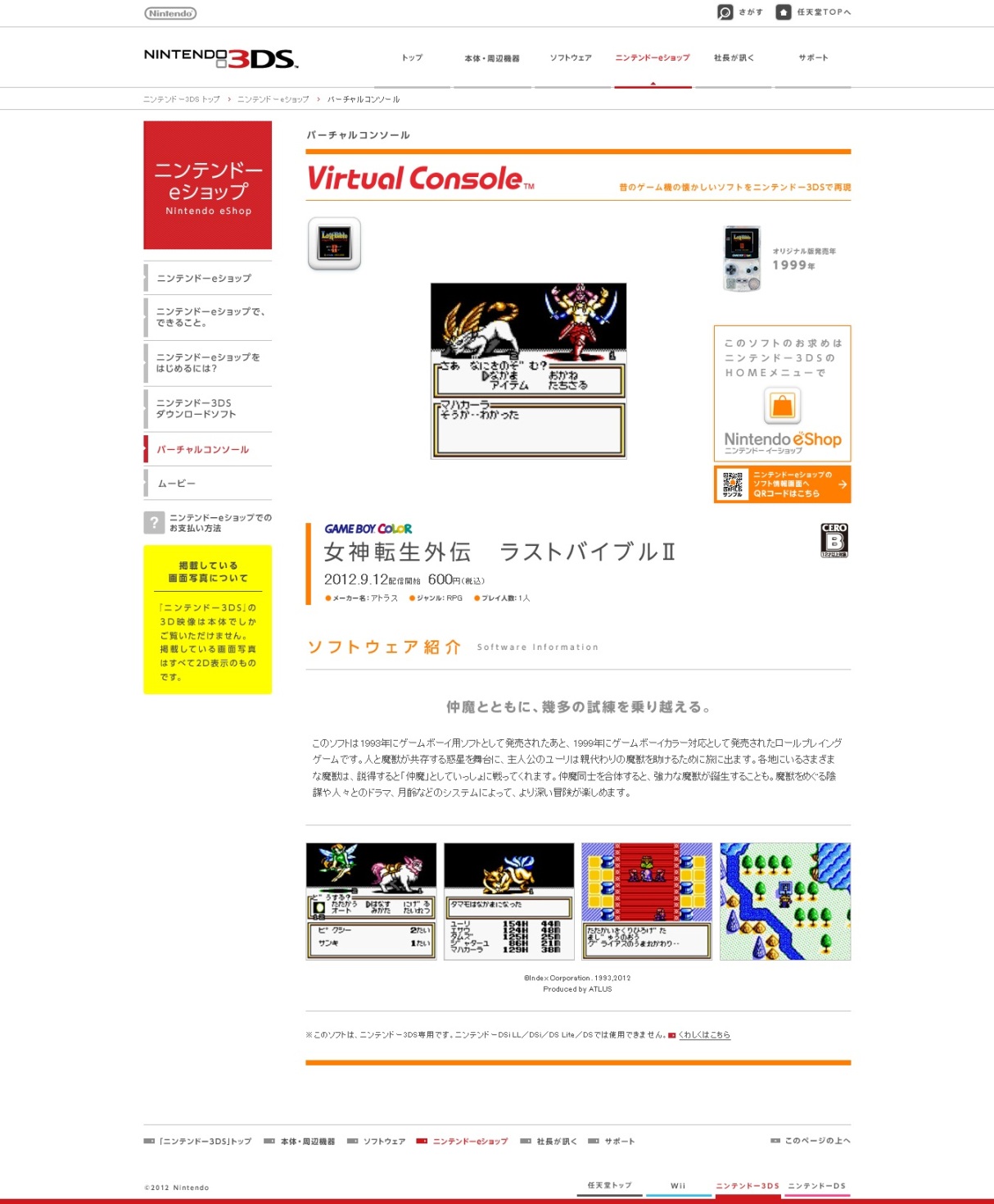 Megami Tensei Gaiden: Last Bible II will be hitting the Japanese eShop as a Game Boy Color download on September 12 for 600 yen. Screenshots of the game can be found above.
