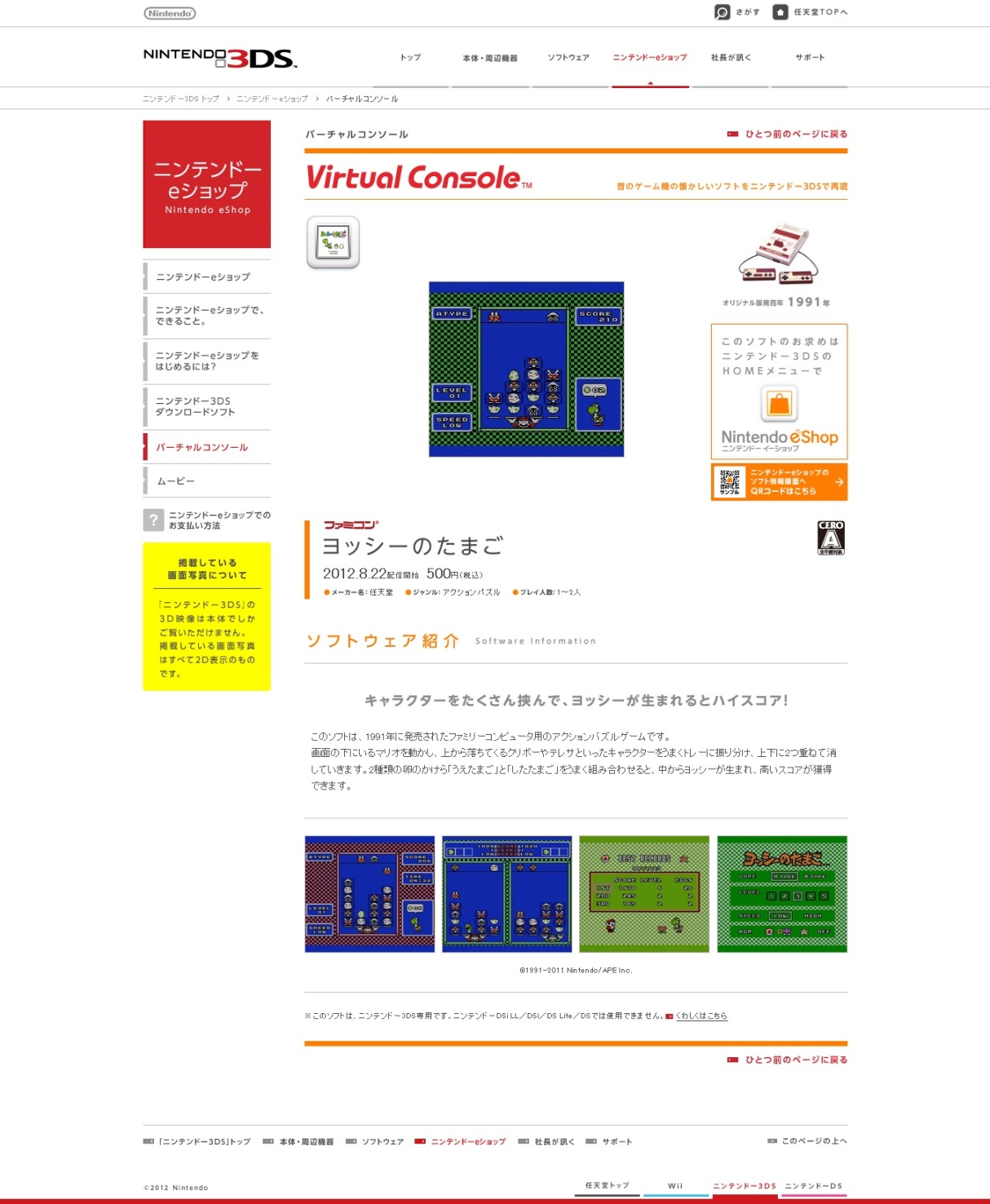 Yoshi will be hitting the Japanese eShop as a Famicom download on August 22 for 500 yen. Screenshots of the game can be found above.