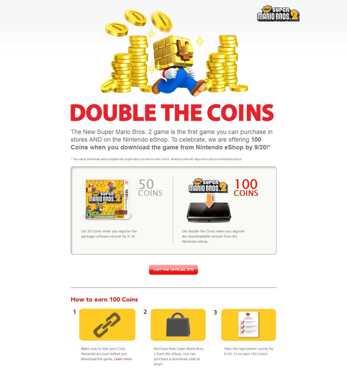 Much like Japan, a bonus will be available on Club Nintendo for consumers who purchase New Super Mario Bros. 2 digitally. If you buy the game before September 20 and fill out a registration survey, you’ll receive double the amount of coins – 100 instead of 50.