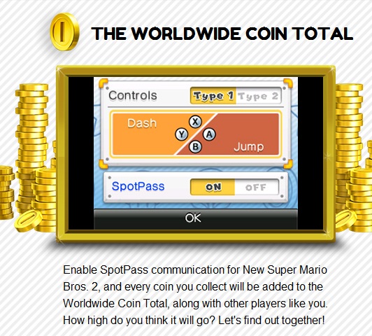 Perhaps the most interesting addition to the site is a “Worldwide Coin Total”. If you have SpotPass enabled, your coin count will be added to the overall total on the New Super Mario Bros. 2 site. Nintendo asks, “How high do you think it will go? Let’s find out together!”