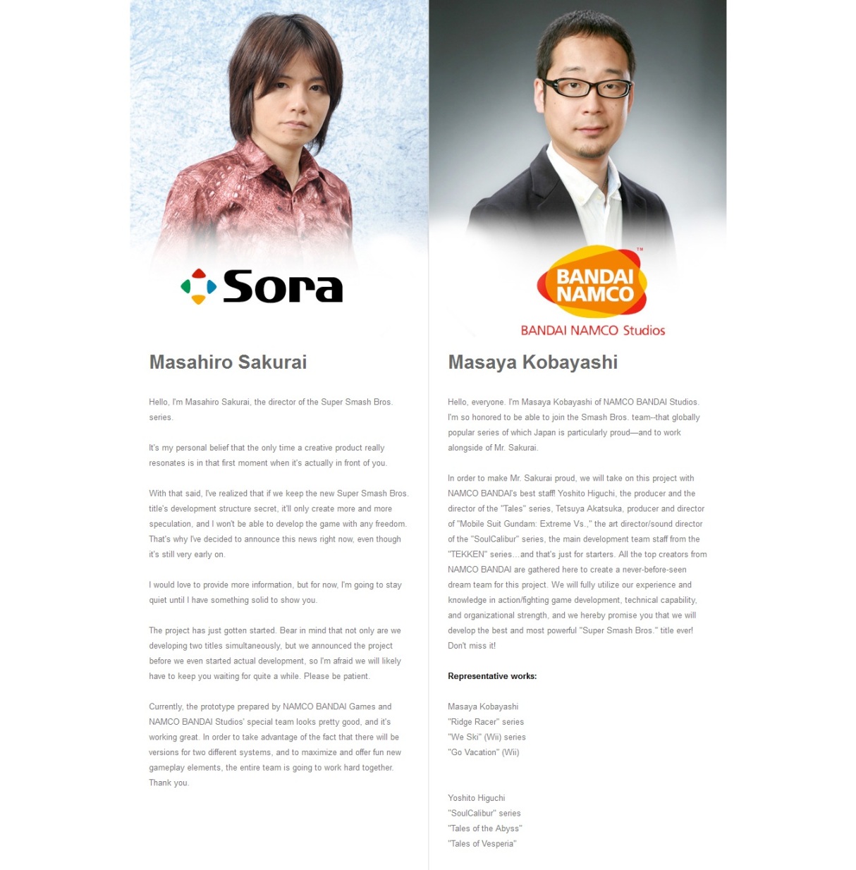 New Super Smash Bros. – message from Sakurai and Kobayashi