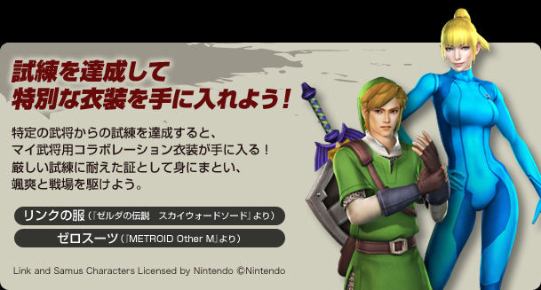 The previously reported Link (Zelda: Skyward Sword) and Zero Suit Samus (Metroid: Other M) costumes will be included in the card itself rather than through DLC. Both can be accessed once the tutorial mode has been completed. Dynasty Warriors Vs.’s official site states that players will be able to use the costumes in the “My General” character creation mode.
