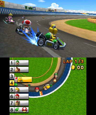 At the heart of Mario Kart is multiplayer racing. Using a broadband Internet connection or local wireless built into the Nintendo 3DS, players can race against their own friends or even against opponents worldwide. The new Community feature allows players to create groups with other Mario Kart fans while setting up specific rules to make customized racing environments. Easy setup allows players to quickly create a community and share with others via the StreetPass™ feature. Community leaderboards will also show the most up-to-date information from recent races. Solo players can race through the Grand Prix and Time Trial modes using either the Circle Pad layout or the motion-sensitive gyro controls of the system to steer their karts. The gyro controls also allow players to control their karts in a first-person perspective, a feature never before seen in the Mario Kart franchise.