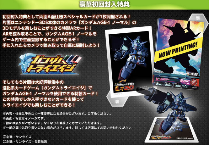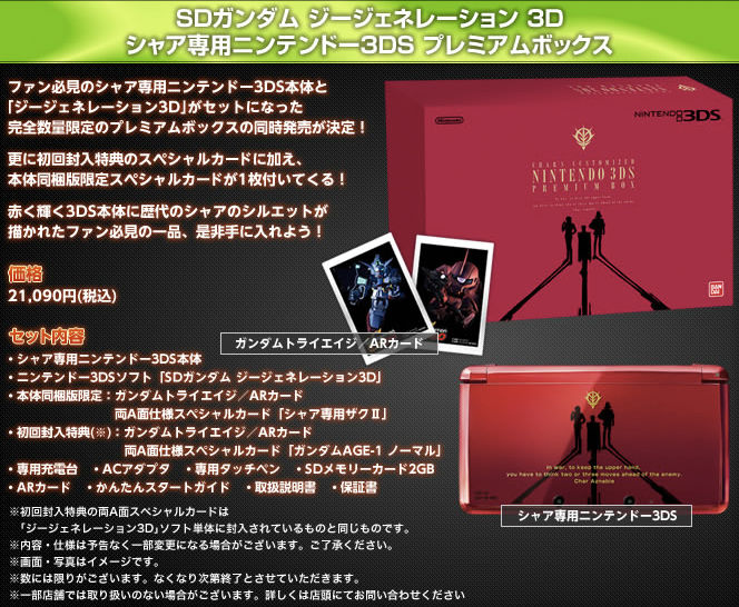 Let the 3DS bundles continue! Namco Bandai will be offering a package of their own for SD Gundam G Generation 3D that includes a copy of the game, a Gundam Tri AR card featuring a Char Zack II Mobile Suit, and a 3DS console.