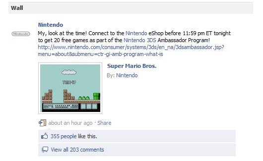 If you have a 3DS and would like twenty free games, make sure you connect to the eShop by 11:59 PM EDT tonight. The first batch of titles (NES) will be available on September 1. The free GBA games will be released before the end of the year.