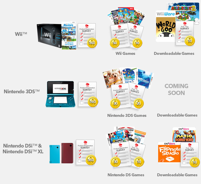 Registering your 3DS system will provide you with 160 coins, just like the Wii. Software registration surveys are worth 30 points, but post play surveys are worth 20 points. Not too bad if you ask me!