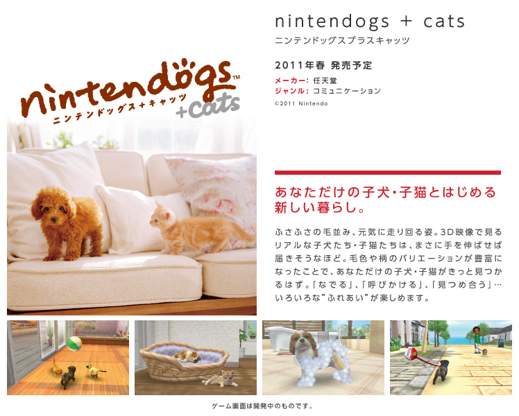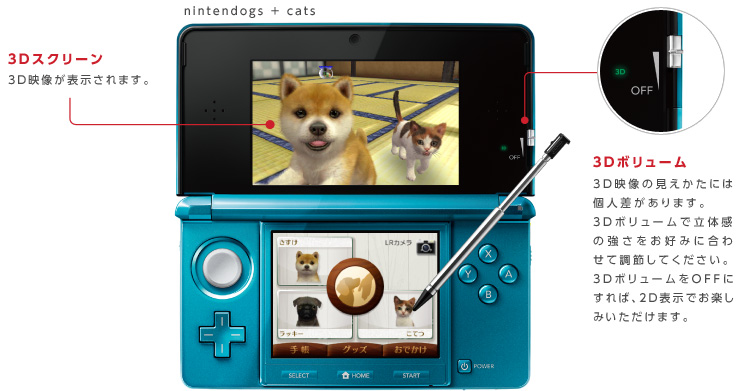 3DS photos showing built-in software, menu, nintendogs + cats, and cartridge