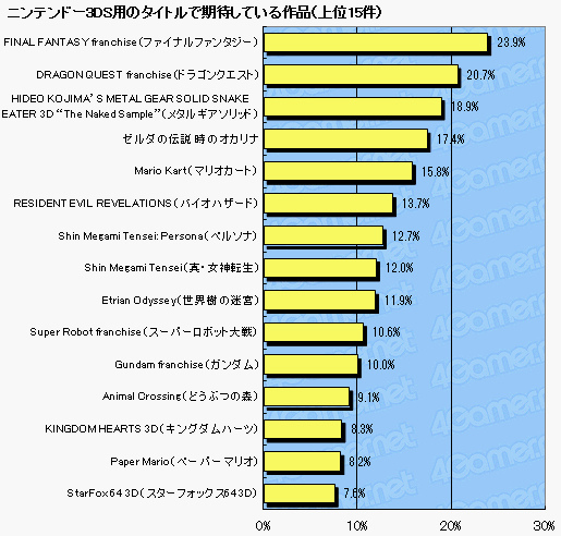 A total of 21,810 Japanese gamers were asked which 3DS title they’re looking forward to the most. As you can see, the unnamed Final Fantasy title topped the list, with the mystery Dragon Quest title following right behind. In case you were wondering, Ocarina of Time 3D stands at position four.