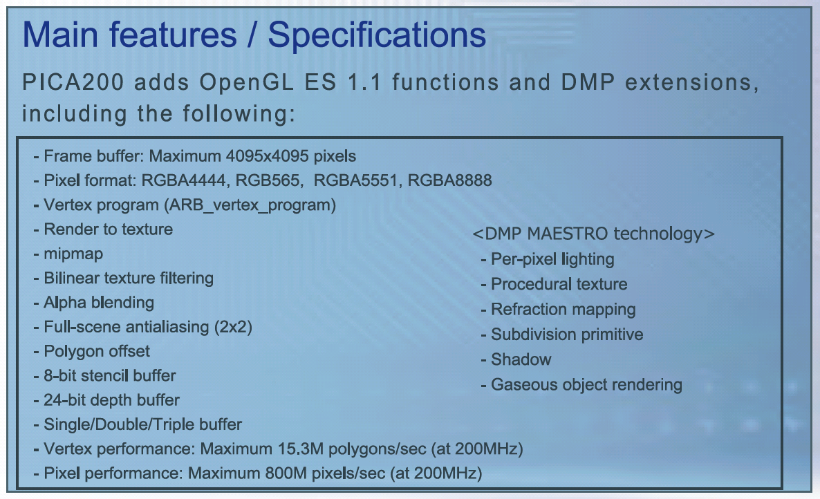 “The PICA200 scales with up to four pipelines and processes from up to four programmable vertex units. The 3D core, using their proprietary graphics technology named MAESTRO-2G, the second generation of the Maestro design, implements custom graphics algorithms as hardware for enabling a set of shading features that include per-vertex sub-surface scattering, bidirectional reflectance distribution function, cook-torrance, polygon subdivision, and soft shadowing. Their image post-processing module, the PICA-FBM frame buffer management, can polish the image with anti-aliasing and a set of other 2D functions and can actually be licensed independently as a core for 2D-only devices. In either case, the PICA-FBM can be extended with a PICA-VG vector graphics module.”